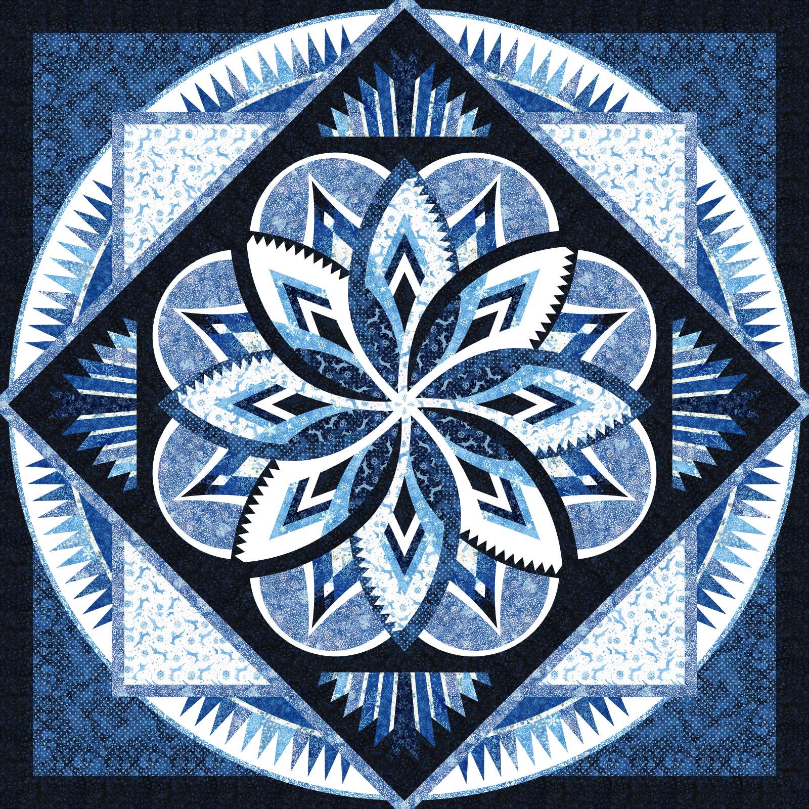 Peppermint Twist is a foundation paper pieced pattern by Quiltowrx.com. This kit includes fabrics from an assortment of Island Batik Christmas Collections in Blues and whites for a frosty holiday themed feel. The quilt includes 22-1/2 yards of fabric, including the binding, and can be purchased with or without the pattern. Note that if purchased without the pattern, you will need the Peppermint Twist design plus the Cogs and Blocks Border to complete the quilt. The Cogs and Blocks border should be the most recent version as it has cutting instructions to reflect the colorwave of fabrics in the spikes around the border.