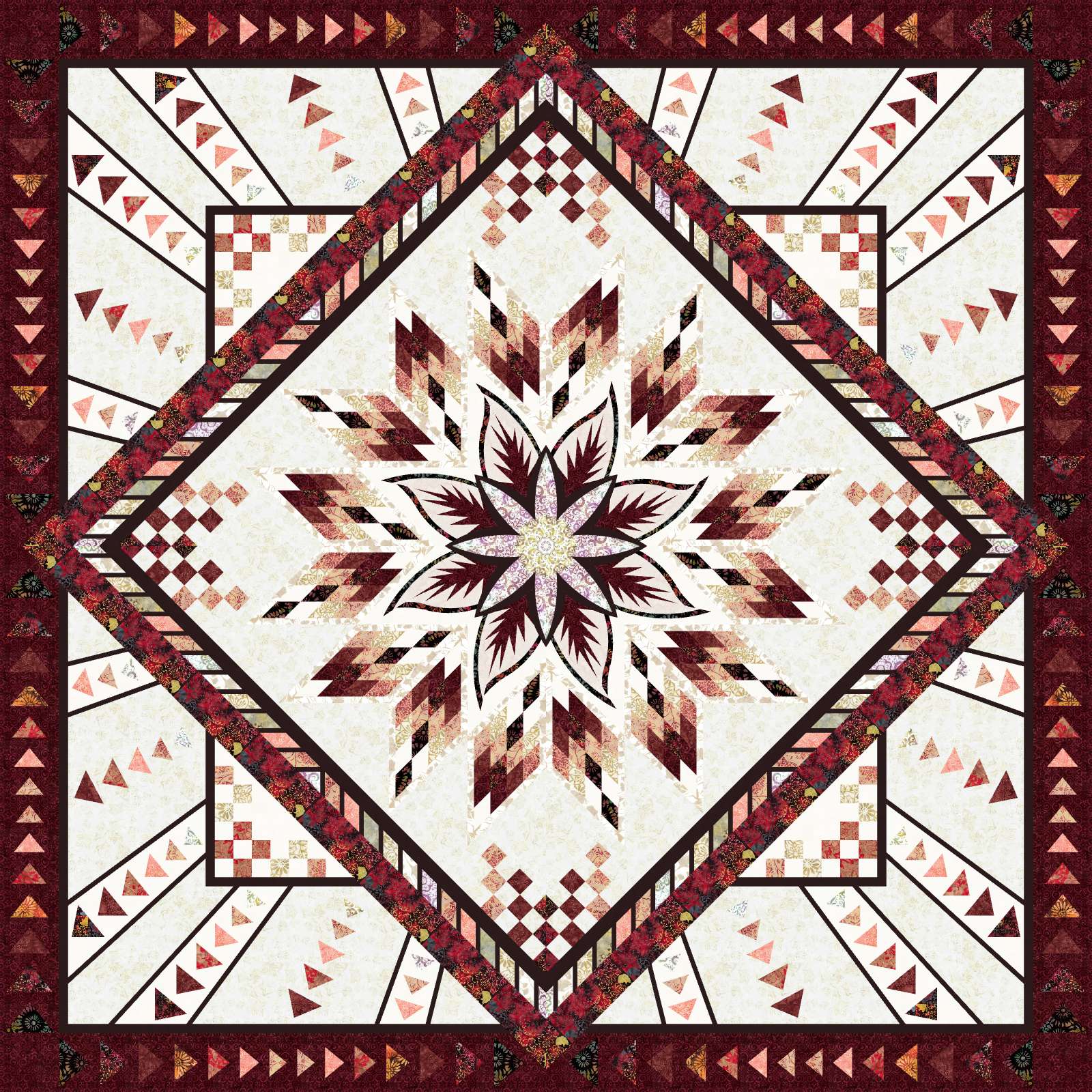 This Fancy Flamingo King kit is a foundation paper pieced pattern by Quiltworx.com that includes the pattern with an added border package to enlarge the original quilt from 80" to 118" square. It was created by Judel Niemeyer in Quiltster using 28 yards of Timeless Treasures' Apple Basket fabric line. It includes the binding and can only be purchased with the pattern.
