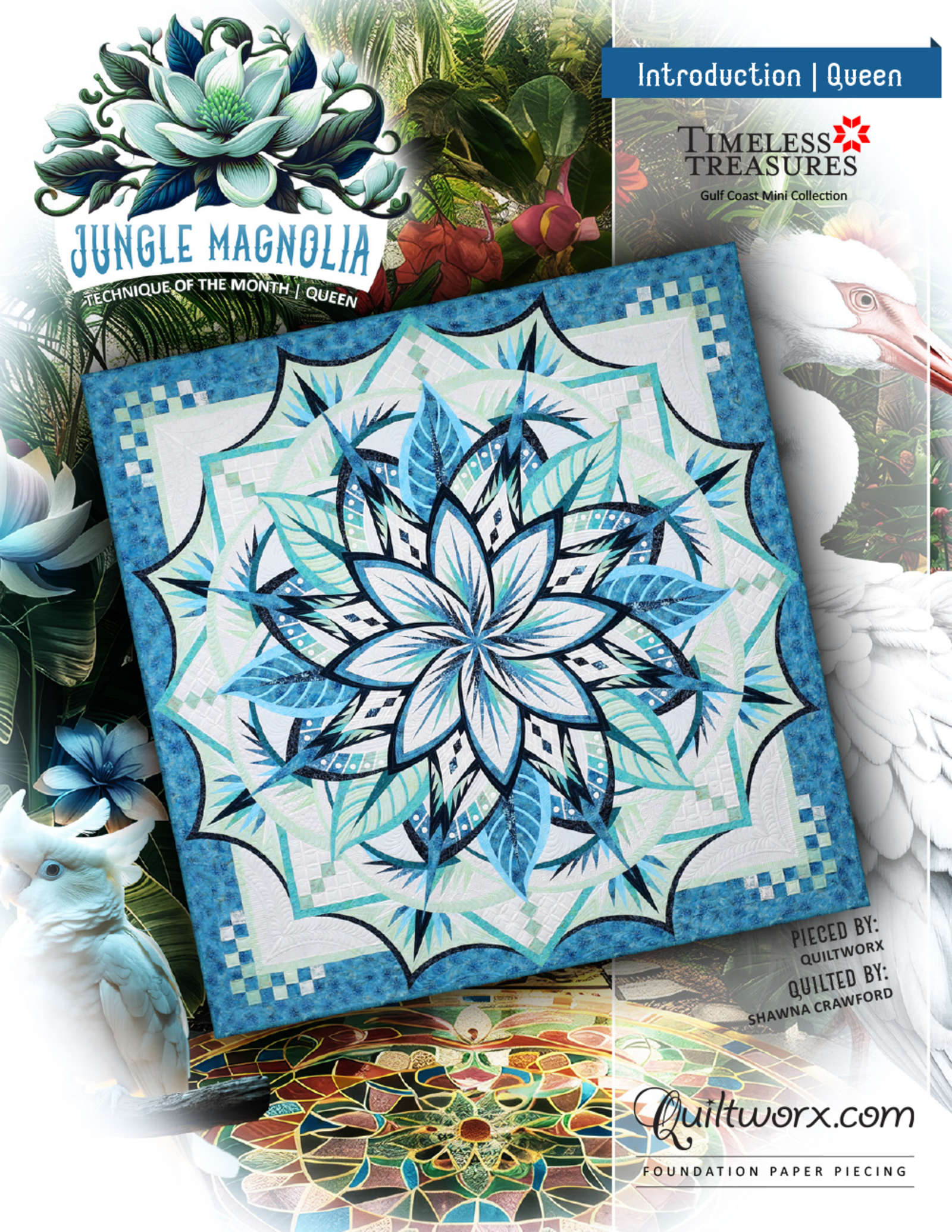 The Jungle Magnolia Queen is the 99" version of the 2025 Quiltworx Technique of the Month project. These designs are meant to be a multi-month, workshop driven pattern, that is taught and distributed by a Quiltworx Certified Shop or a Shop that is working with a Quiltworx Certified Instructor. You can also purchase this project through a workshop offered by a Certified Instructor that is held outside of a shop as well. The design is offered in 2 sizes, a Wall and a Queen. A wall expansion to take this to a King size is available as an alternative expansion project. This does NOT fit the Queen size quilt. In May of 2025, we will be publishing an adjustable border that will be able to take this project from a 99" queen to a 118" king as well. Stay tuned for more information.
