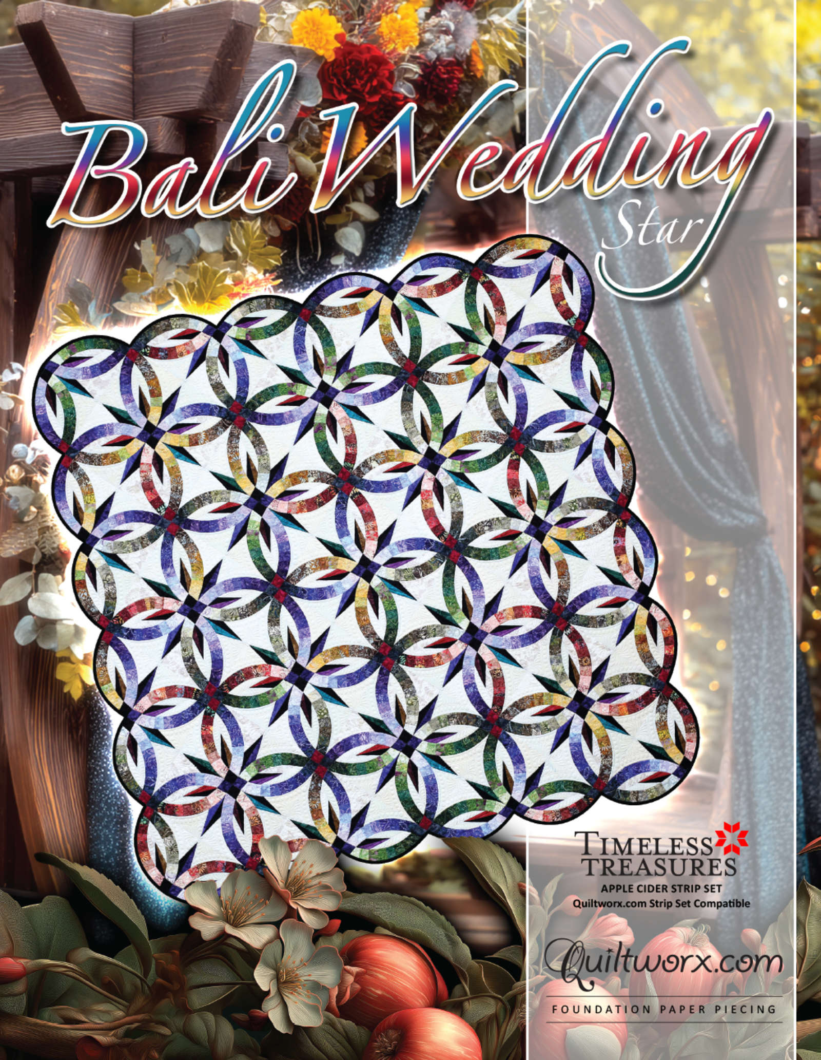 Originally designed in 1996 by Bradley and Judy Niemeyer, the Bali Wedding Star has become a beloved icon in the quilting world—an enduring symbol of romance, craftsmanship, and innovation. With redesigns in 2008, 2014, 2016, and 2018, this pattern evolves alongside our techniques, ensuring every new release is more efficient, more elegant, and more inspiring than the last. This latest update celebrates the heart of the design while embracing modern ease. Using 2-½" strips to create dazzling ring sets, Bali Wedding Star is compatible with all Quiltworx Strip Sets—and now features the stunning Apple Cider Strip Set in rich Tonga Batiks. These warm, spicy tones evoke the golden glow of autumn, wrapping your quilt in a sense of comfort and timeless beauty. You can find the Apple Cider Strip Set by contacting your favorite Quiltworx Certified Quilt Shops or browsing kits available through the Quiltster Marketplace. Quiltworx also offers a version using the very popular Tim Holtz Strip Set, curated by Judel Niemeyer. 📦 What’s Included: Full-color cover sheet Step-by-step instructions Yardage information Foundation papers and templates
