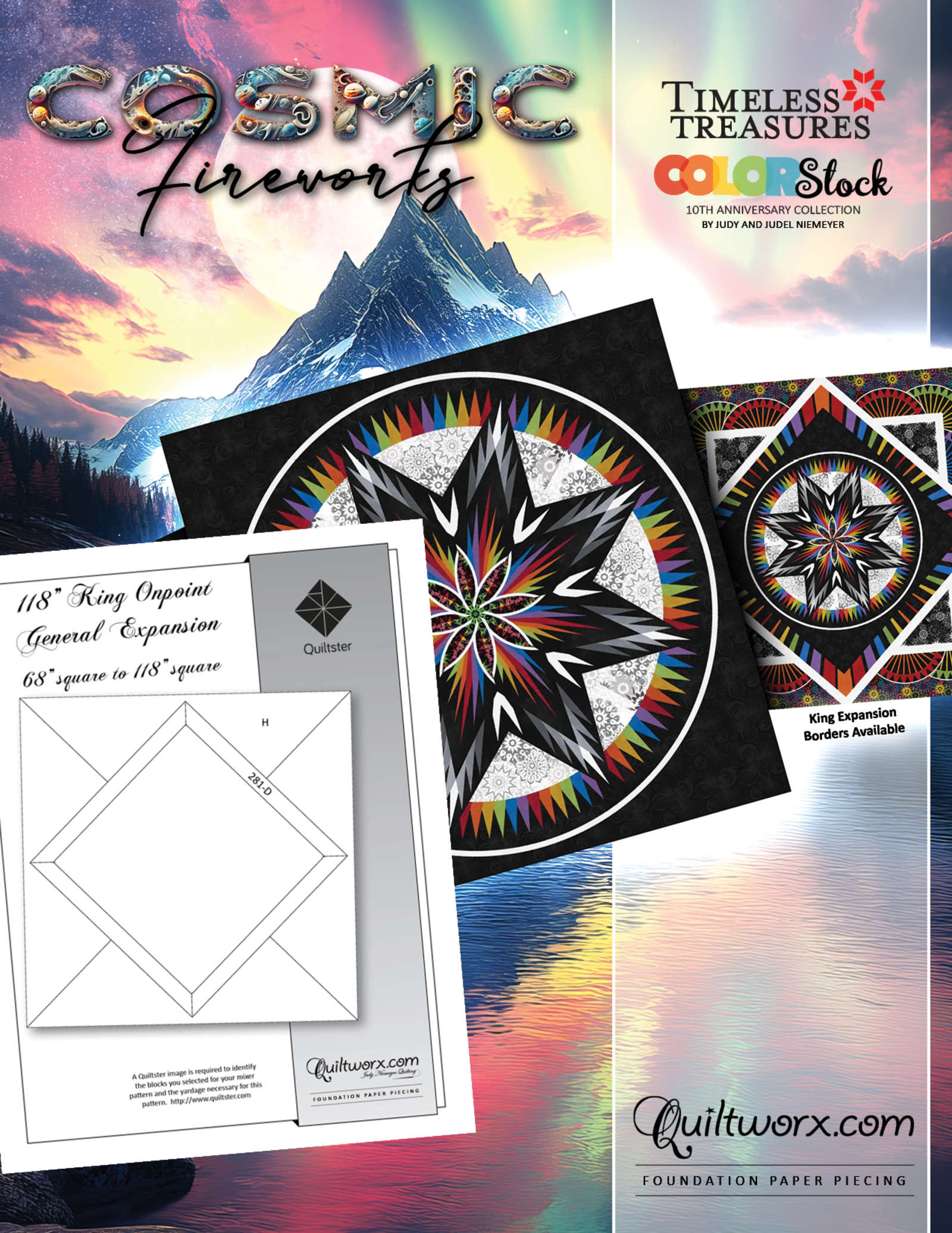 The Cosmic Fireworks pattern is the pattern that Quiltworx has created for the 2025 Quiltworx Box Program. It is available as a stand-alone pattern and can be purchased in 3 different sizes. This layout creates a 118 inch finished project. If you would like this design in a 99" queen or 68" wall, please find the Cosmic Fireworks Queen or Wall layouts in Quiltster and begin designing your quilt there instead.