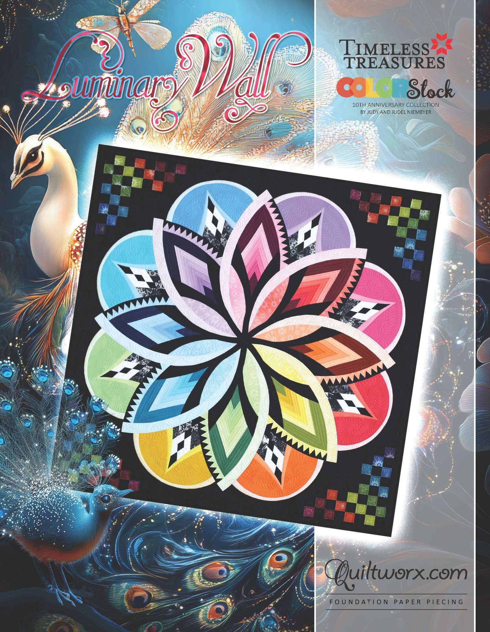 Luminary Wall is a foundation paper piecing pattern by Quiltworx.com. This design was created from Quiltworx Hosta series of mixer blocks designed in 2025. The design was also created to showcase a rainbow of colors, making it a perfect option for use with the ColorStock Cottons Basics collection designed by Judy and Judel Niemeyer. This collection showcases a collection of fabrics in every color of the rainbow that make the same steps in tone and shade from one color to the next.